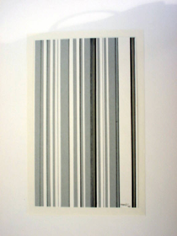 Il fondo è completamente occupato da righe parallele di vario spessore nei colori bianco, grigio , nero