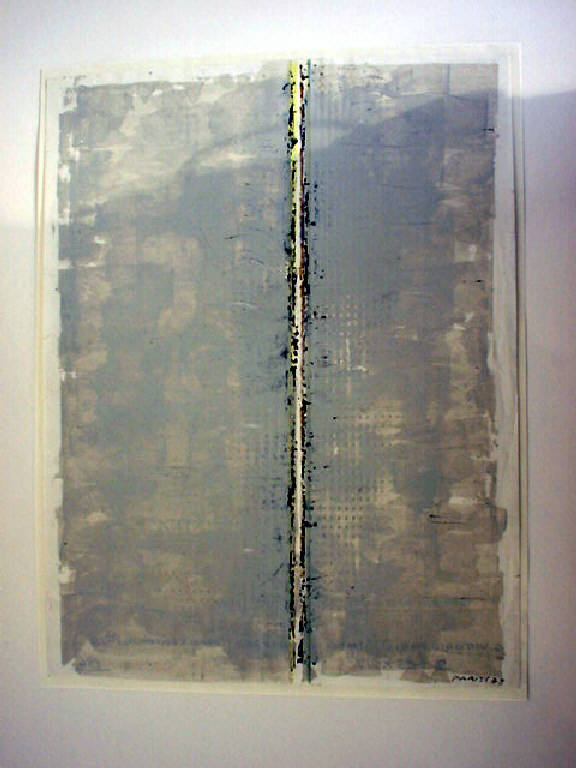 Con l'uso di una tempera molto diluita è steso un fondo grigio, sul quale emerge una fascia bianca dai contorni slabbrati di nero
