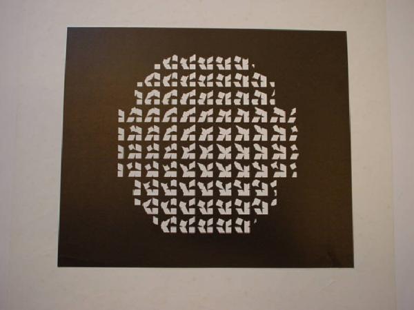 Su fondo nero un'area esagonale è riempita interamente da moduli seriali bianchi ottenuti dalla combinazione di altri moduli più piccoli a forma di parallelogramma o di quadrato.