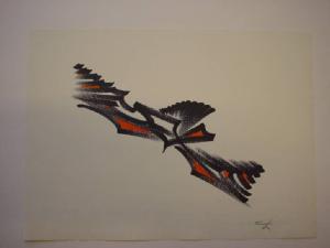 Con un tratteggio spesso condotto per linee olique e parallele è definito un uccello in volo - il colore utilizzato è, oltre il nero, l'arancio