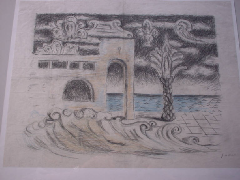 Architettura di fantasia in riva al mare; anche il cielo scuro si popola di forme bizzare e surreali