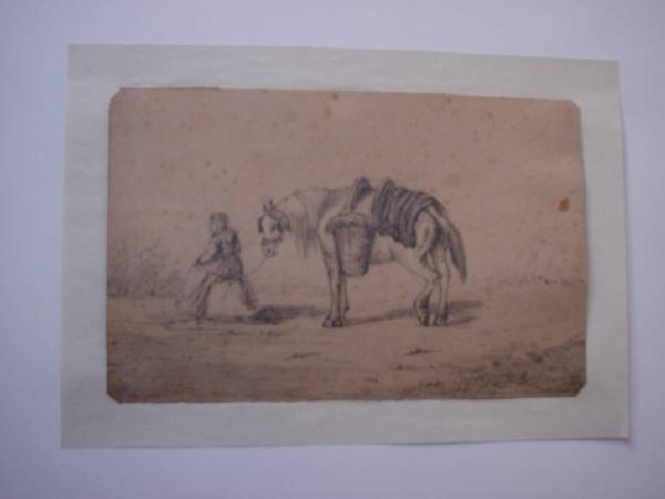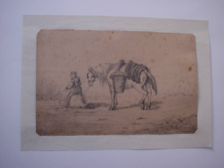 Di profilo è raffigurata una pastorella seduta su un masso., che tiene per le briglie il suo cavallo.