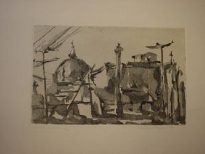 Con un fitto tratteggio incrociato è rappresentato uno scorcio della città di Roma. L'autrice fa a meno delle linee di contorno, caratterizzando con mano sicura le volumetrie architettoniche