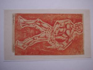 Ritratto a figura intera di un pescatore che avanza in direzione diagonale con in braccio una cesta di pesci. Lo sfondo è di color porpora