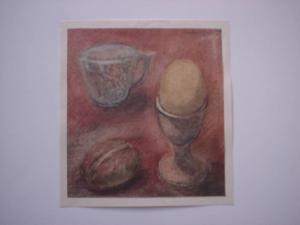Sono rappresentati dall'alto, in una disposizione molto libera sul piano di sfondo campito di porpora, un portauovo, una michetta di pane e una tazzina in ceramica decorata.