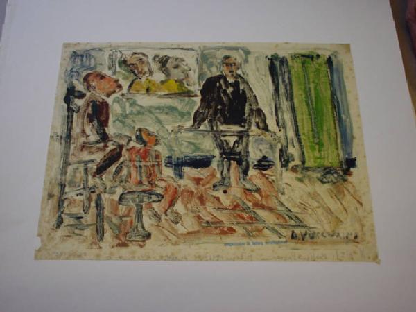 In un interno caratterizzato solo dalla presenza di una tenda verde sullo sfondo, sono presenti un personaggio maschile, in piedi, vestito di nero, e due altri uomini seduti e rappresentati di profilo. Il segno e il colore sono di marca evidentemente espressionista.