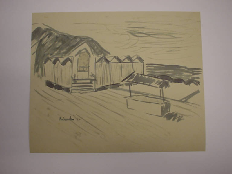 Con l'uso di un inchiostro molto diluito con tratti compendiari è realizzato lo scorcio di una spiaggia con le sue cabine