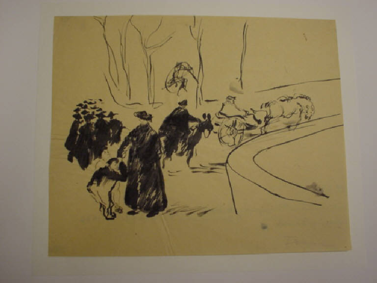 Un gruppo di prelati, connotati dal classico abbinamento mantella e cappello a falde larghe, sembrano allontanarsi dopo la partenza del carro