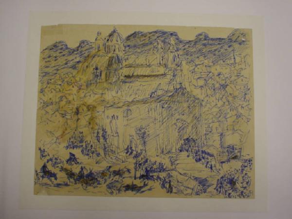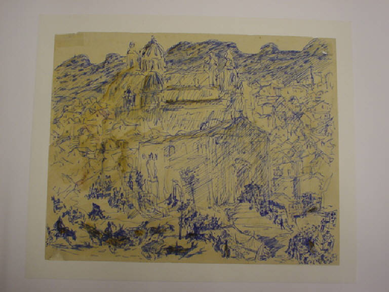 Manca quasi la linea dell'orizzonte nella rappresentazione dell'alto di un borgo tra le montagne dove si intravedono figure in movimento