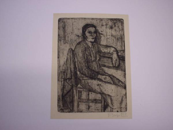 Seduta di tre quarti rispetto allo spettatore, una figura femminile in abiti popolani appoggia un braccio sul tavolo adiacente mentre tiene riverso l'altro sulla gamba. Lamodella non guarda lo spettatore, e ha un'espressione di sofferenza e rassegnazione.