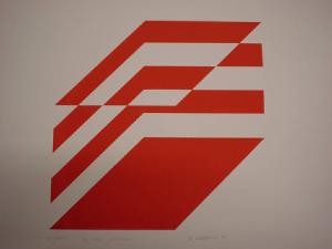 Composizione geometrica di segno astratto nei colori del rosso, con un rombo obliquo centrale
