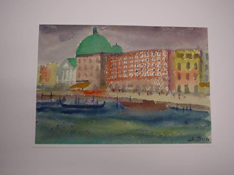 Rappresentazione di un angolo della città di Venezia, con i suoi canali, i suoi ponti, e le case una addossata all'altra.Sullo sfondo è bene visivile la cupola della Cattedrale di San Marco.