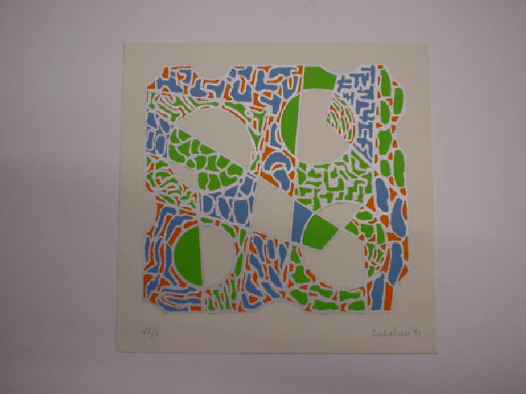 Composizione astratta caratterizzata dalla disposizione, entro le quattro aree entro cui si può dividere il quadrato, di circonferenze contornate di bianco, sovrapposte ad uno sfondo riempito con motivi decorativi mistilinei nei colori verde, arancio e azzurro.