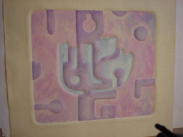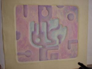 Calcografia che evidenzia una serie di forme pseudogeometriche dagli angoli smussati, accostate tra loro. I colori usati sono il viola, il rosa e l'azzurro.