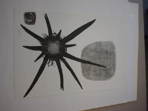 Una forma stellare di colore nero contiene al suo interno un fitto groviglio di linee grigio chiaro.Sulo sfondo due chiazze di colore grigio e di forma rettangolare smussata.