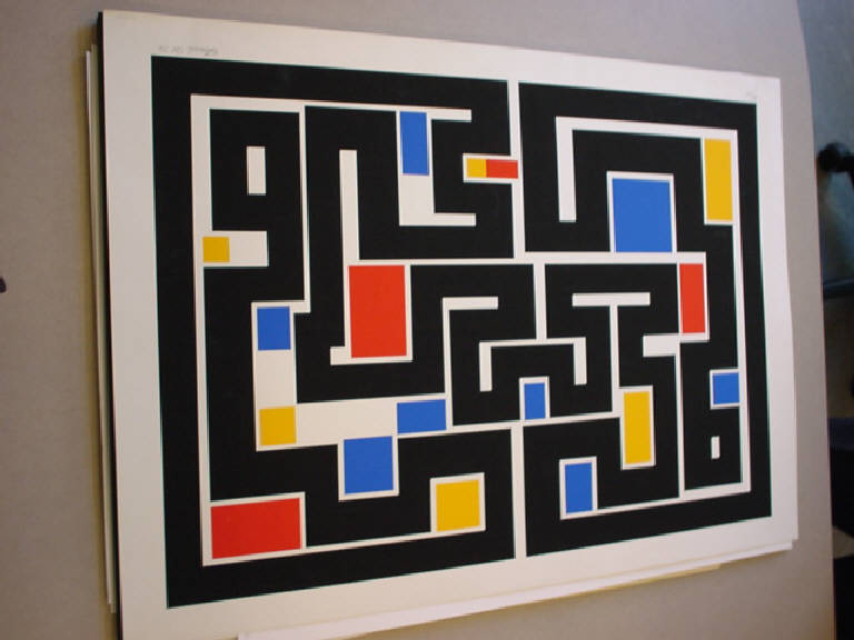 E' come un labirinto contenente al suo interno forme rettangolari arancioni, gialle e azzure, la composizione astrattta di Maldonado.
