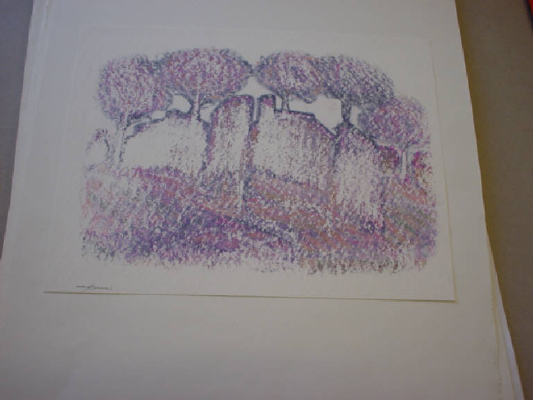 Con la tempera vaporizzata è suggerito un paesaggio mediterraneo. I colori utilizzati sono il viola chiaro e l'azzurro.