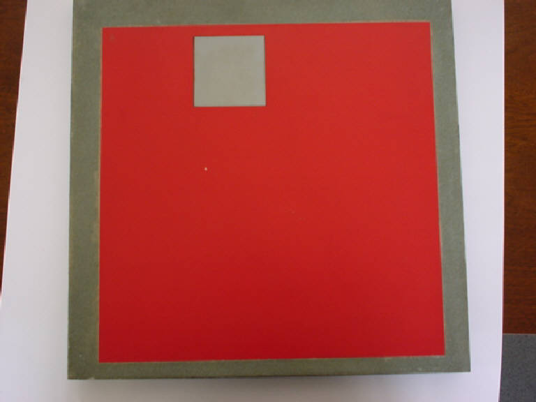 Bidimensione caratterizzata dalla sovrapposizione a una superficie quadrata a silicato di una lamina plastica di colore rosso.
