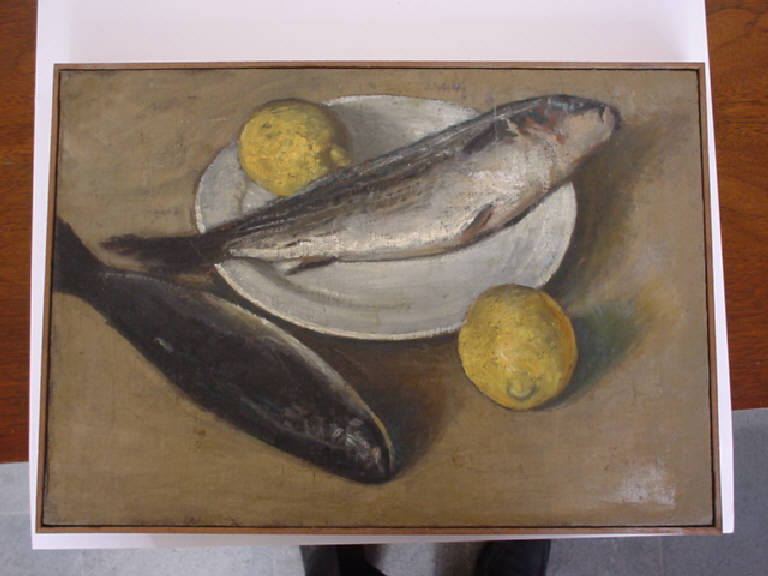 Natura morta composta da due pesci, due limoni e un piatto ripresi dall'alto.