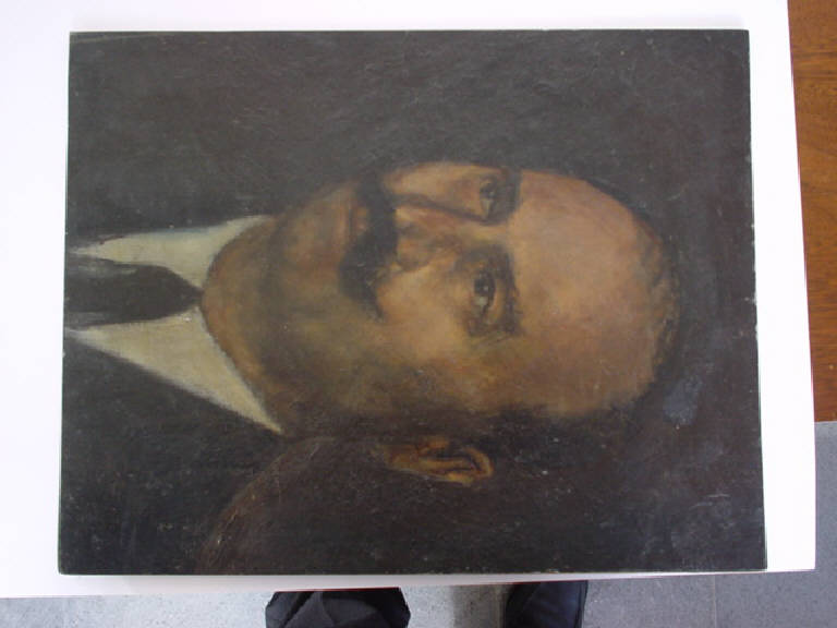 Il volto e metà busto del padre sono ritratti in modo convenzionale. Lo sfondo è neutro, trattato a smalto nero.