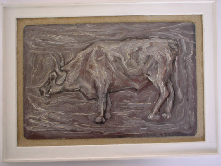 Rappresentazione realistica di un manzo al pascolo, contraddistinta però dall'uso di colori antinaturalistici (grigi, viola, bianchi)