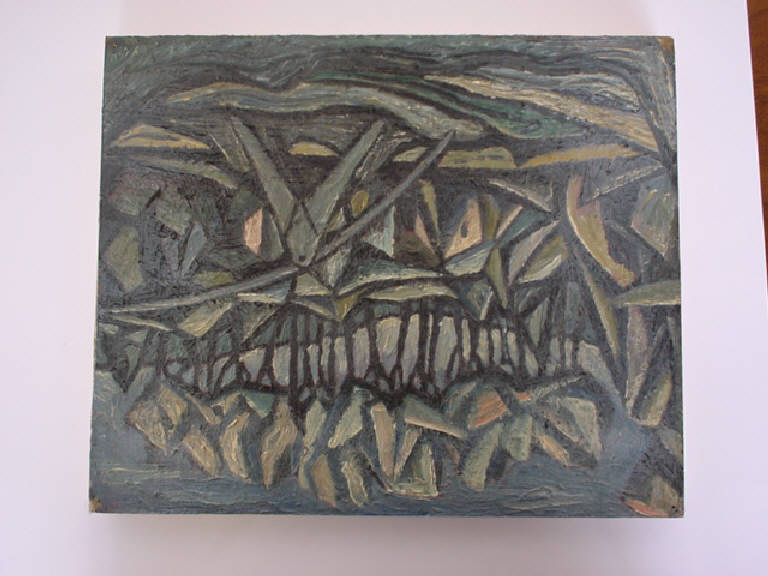 Rappresentazione di una draga da fiume strutturata entro volumi geometrici di marca tardo cubista. Sullo sfondo una fila di alberi. Dal punto di vista cromatico prevalente l'uso del blu e del nero, rialzati da bianco, giallo e verde.