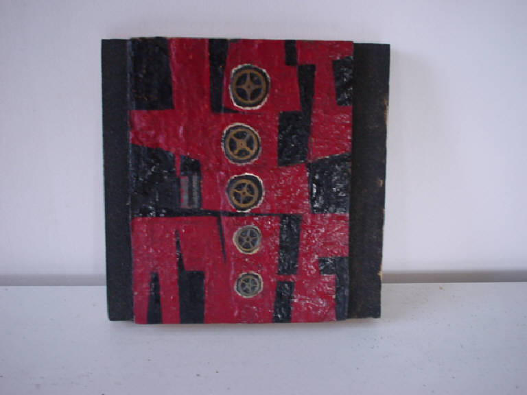 Su un piano bidimensionale trattato a silicato grigio scuro si inscrive in leggera dissimmetria dinamica e con andamento verticale un altro piano, emergente dallo sfondo. Su di esso si dispiega una narrazione di forme pseudo geometriche trattate a smalto rosso e nero