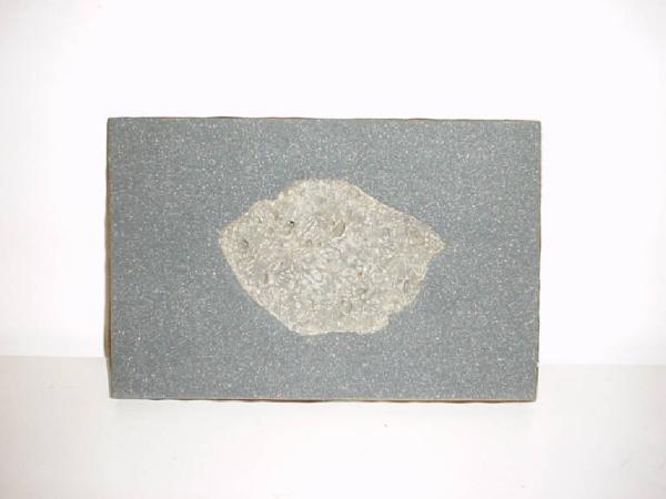 Sul piano grigio trattato a smeriglio è incastonata in forte rilievo una pietra di arenaria corrosa dagli agenti atmosferici, sulla quale si evidenzia una concrezione marina costituita da conchiglie