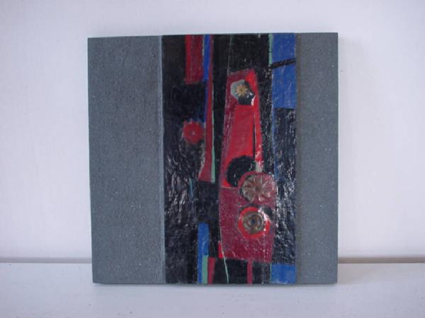Sul piano trattato a smeriglio grigio è presente una zonatura verticale contenente inserti polimaterici in metallo a forma stellare e forme irregolari di colore rosso, nero, blu e verde acqua.