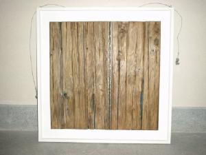 Su due tavole sovrapposte di legno antico sono applicati due elementi verticali metallici
