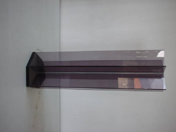 Su una base esagonale irregolare in polimetacrilato colore bruno sono appoggiate per la base 6 lastre rettangolari allungate color fumè che partono dai vertici dell'esagono per convergere tutte in un punto centrale, dove è collocato un lungo cilindro trasparente