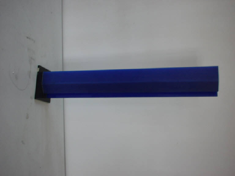 Su una lastra di polimetacrilato lucido nero poggiano dirimpetto due lastre piatte sagomate di polimetacrilato blu opaco