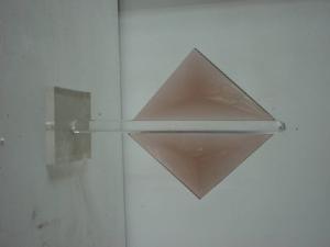 Su una base in polimetacrilato trasparente è applicato un elemento esagonale dissimmetrico. Sulla facce più strette è applicata la base di due triangoli isosceli color grigio fumo di altezze diverse