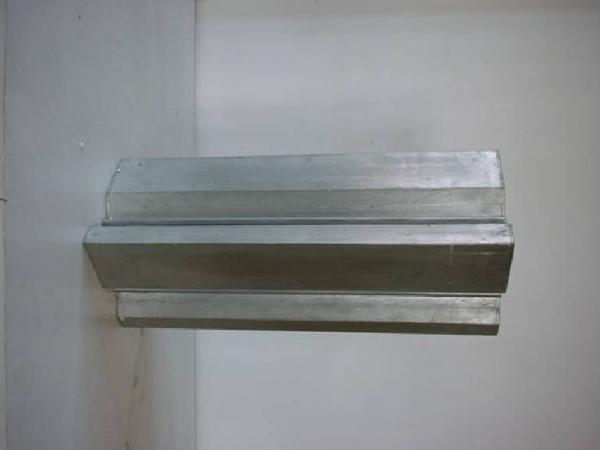 Un modulo parallelepipedo, senza base, caratterizzato da un certo sviluppo verticale, è tagliato sui quattro lati da profonde scanalature triangolari, poste in dissimmetria dinamica dove appoggiano dei cilindri metallici cavi