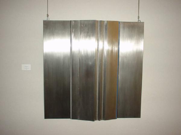 Due elementi incrociati in dissimmetria dinamica e costituiti da moduli a sezione quadrata (realizzati alternativamente in acciaio lucido e satinato) sono assemblati a scansione alternata e in dissimmetria dinamica. I due elementi sono collegati alla base quadrangolare da un modulo a sezione quadrata che si pone rispetto a questa in dissimmetria dinamica.