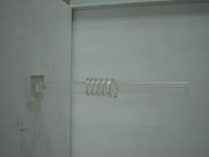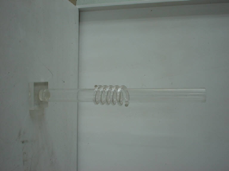 Al centro di una base quadrangolare si innesta un modulo tubolare cavo e trasparente intorno al quale a una certa altezza si svolge una spirale in polimetacrialto trasparente