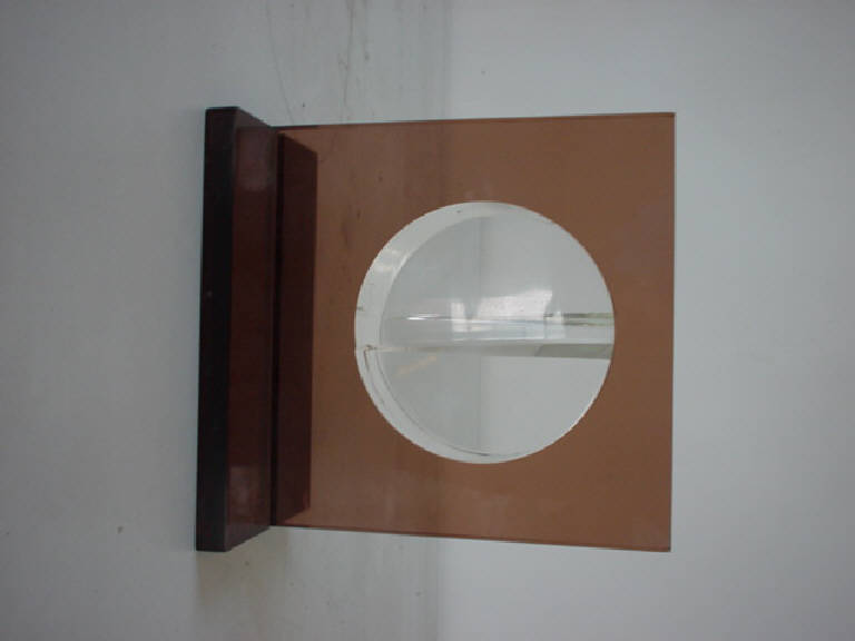 Lastra quadrata di polimetacrilato fumè con un foro centrale, entro cui sono incastrati in altezza due cilindri, che poggia su una base rettangolare.