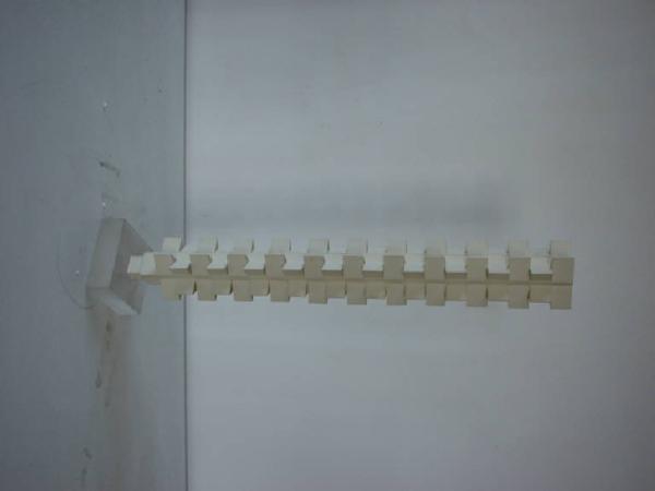 Su di una base rettangolare si innesta un modulo a sezione quadrata alto e sottile. Su ognuno dei quattro lati è applicata in dissimmetria dinamica una serie di 17 elementi parallelepipedi triangolari a scansione alternata. In pianta il bozzetto risulta in forma stellare