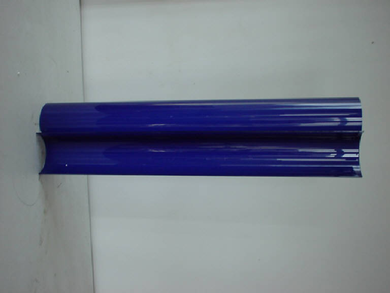 Elegante scultura di segno astratto, composta da due lastre concave blu poste in dissimmetria dinamica, ovvero specularmente ma senza un perfeto allineamento.