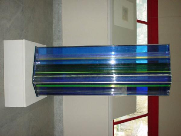 In un parallelepipedo cavo sono disposti elementi di forme e colori diversi, realizzando un gioco di trasparenze.