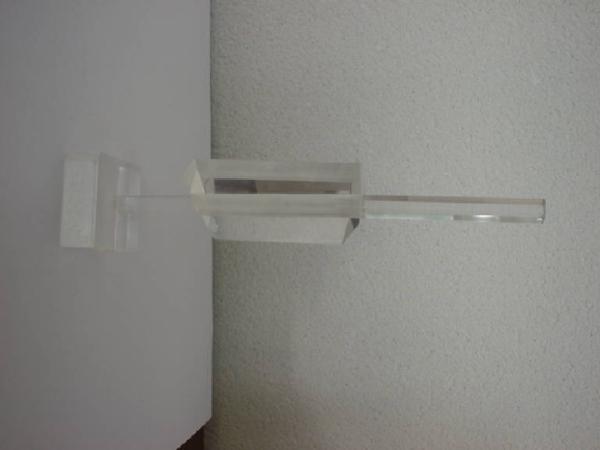 Ad un parallelepipedo allungato trasparente è stato conficcato a metà altezza un elemento prismatico.
