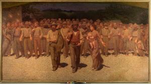 Due uomini e una donna con un bambino tra le braccia, al vero, procedono di fronte, davanti ad una folla di contadini, su fondo di paese.