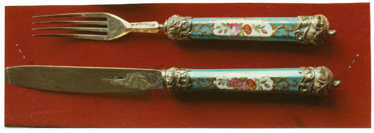 - NOTIZIE STORICO CRITICHE La forchetta, in coppia con un coltello di identica fattura, venne realizzata, relativamente alle parti d'argento, a Sheffield nel 1835, come attestano i punzoni, e verosimilmente dalla stessa ditta, Aktin & Oxley, che produsse il coltello. Essa presenta una ricca decorazione di gusto rocaille. ll manico di porcellana, con decori che riprendono fedelmente quelli delle porcellane di Sevres d'epoca Luigi XVI, è ascrivibile alla manifattura di Minton alla cui direzione erano ceramisti francesi.