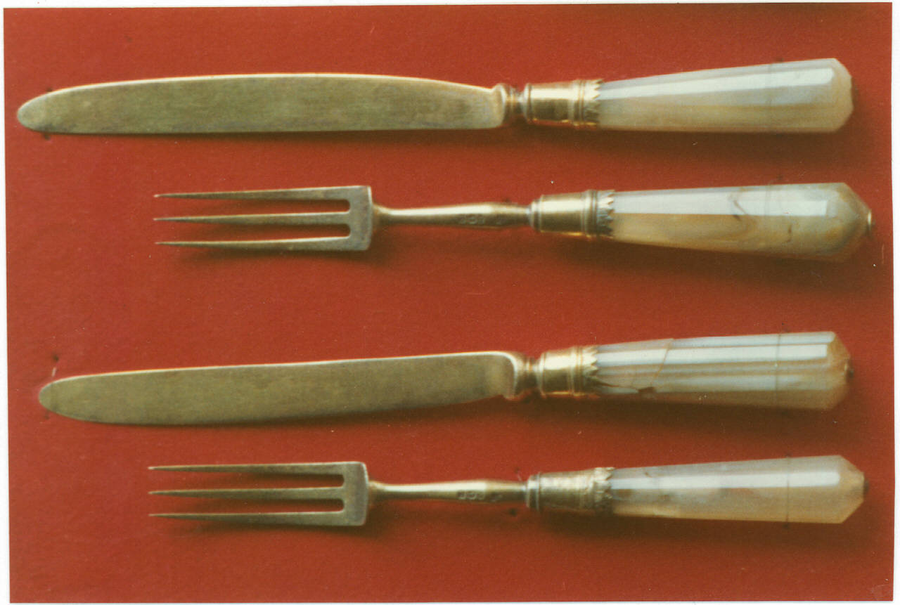 - NOTIZIE STORICO CRITICHE I manici in pietra dura, in questi esemplari forse agata muschiata, assai diffusi nella posateria inglese da tavola tra la fine del Settecento e i primi anni dell'Ottocento, presentano, come anche i collari in cui sono inseriti, lievi differenze dimensionali e nei minuti particolari. La linea geometrica del manico e le minute foglie di quercia che coronano il colletto sono di evidente ispirazione neoclassica. Non è identificato il punzone dell'argentiere che G. Sambonet attribuisce dubitativamente a J. Barnard (scheda Sambonet F/136) ma che potrebbe riferirsi anche a James Beebe, "spoon maker" documentato operoso a Londra nei primi anni del XIX secolo (Jackson). Le forchette sono in coppia con altrettanti coltelli di identica fattura