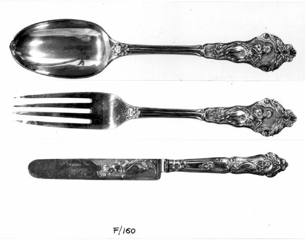 Servizio di posate ta tavola composto da cucchiaio, forchetta e coltello, riccamente ornati da figure femminili in rilievo