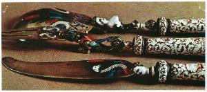 Cucchiaio rivestito da ricca decorazione in smalti policromi. Nella conca, quasi piatta e a pera, due cigni piumati si affrontano araldicamente. Un mezzo busto di donna funge da raccordo col manico, ricoperto da fitti racemi vegetali rosa su fondo bianco e centrato da un medaglione ovale con la raffigurazione della morte di Camilla in policromia