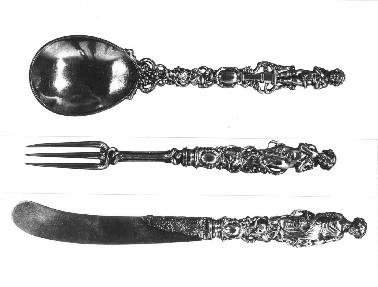 Cucchiaio con coppa ovale liscia e manico a tralci di vite variamente intrecciati terminante con statuetta di putto con grappolo d'uva su piedistallo