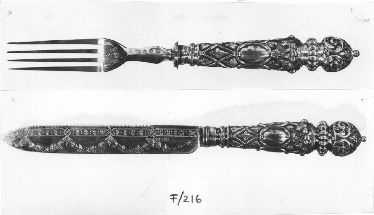 Serie di dodici coltelli: lama parallela a punta, godronata sul dorso e incisa a festoni; manico a sezione circolare, rastremato, con decori fogliacei in losanga e centrato da medaglione ovale liscio; grosso terminale sferico, con volute fogliacee, poggiante su un anello baccellato