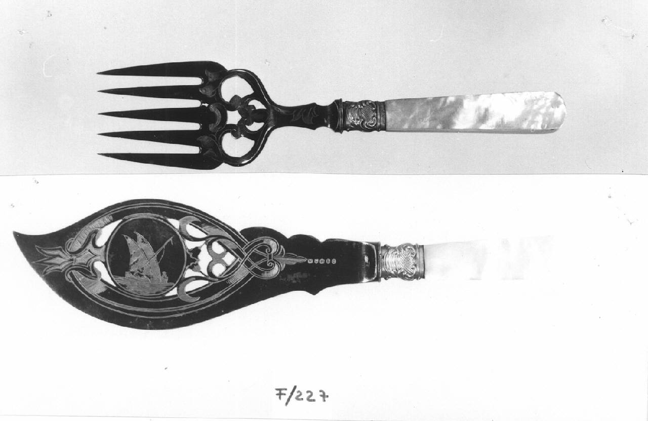 paletta da pesce in Sheffield-plate traforata e incisa, centrata da un medaglione circolare raffigurante un peschereccio fiancheggiato da sinuosi ornati fogliacei variamente intrecciati; manico a sezione rettangolare in madreperla, liscio; colletto sagomato con decori rocaille