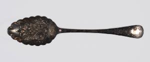 • NOTIZIE STORICO CRITICHE I cucchiai si esemplificano sui "Berry- spoon" inglesi con esuberanti composizioni di frutta e fiori sulla coppa dal caratteristico orlo ondulato e dotati di manico, rispondente al tipo denominato per la forma "Old English", inciso a ornati vegetali e rocaille stilizzati